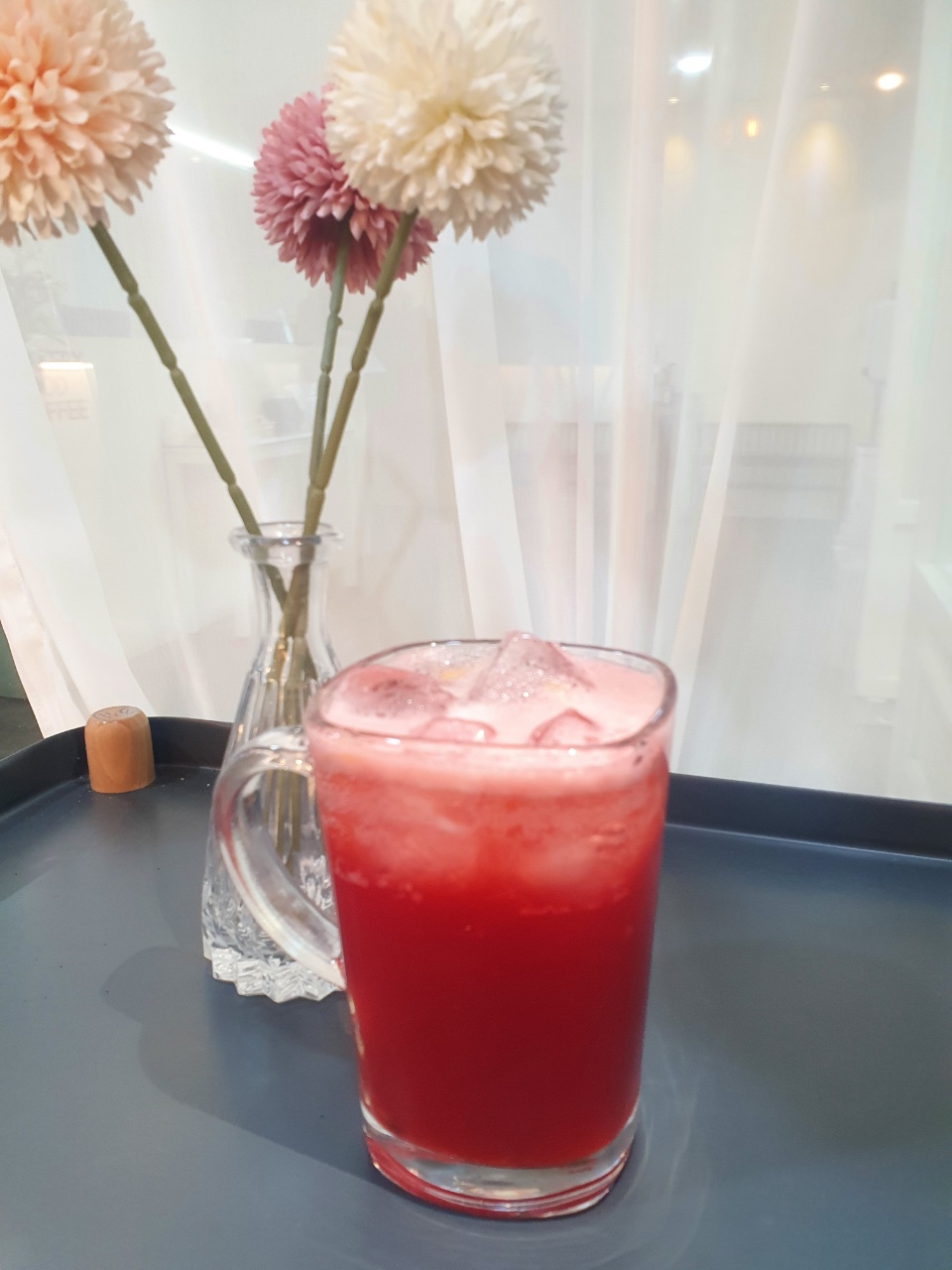 1.히비스커스 2g+ 뜨거운물 100g + 패션후르츠 청 30g + 설탕시럽 15g+얼음 5개를 셰이커에 넣고 섞는다